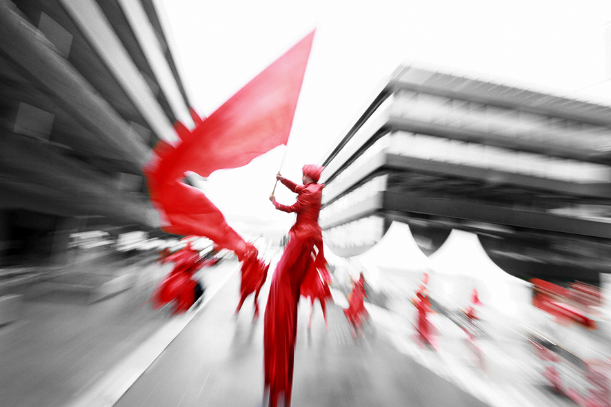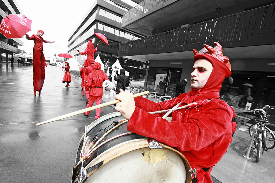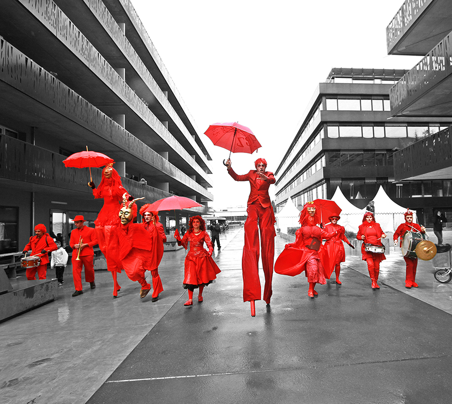 La vague rouge déferle à travers les ruelles, les places et les jardins. Son onde douce ou énergique ensorcèle enfants et adultes. Elle vous plonge dans le monde de l’imaginaire joyeux.